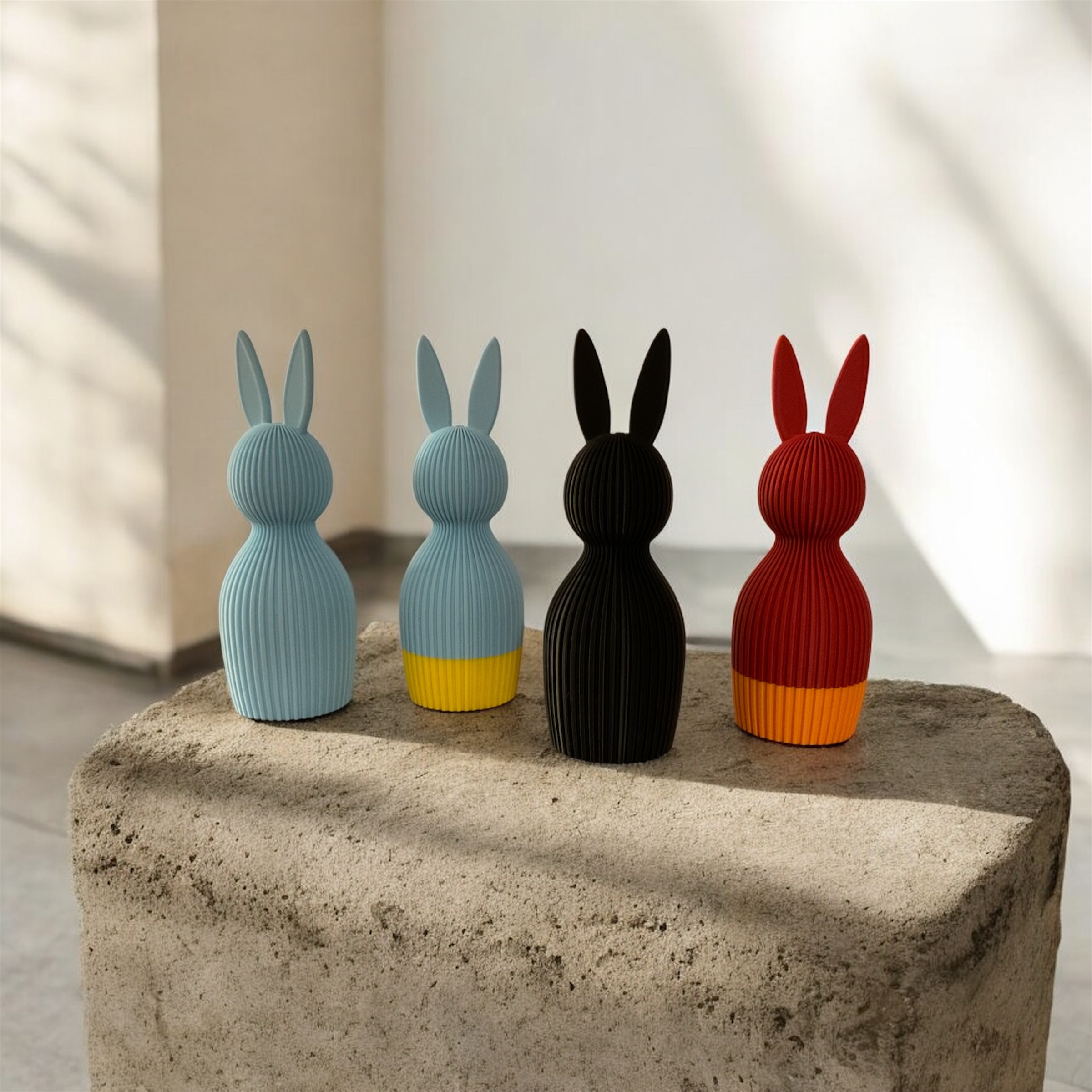 Bringen Sie nachhaltige Frühlingsfreude in Ihr Zuhause mit unserem charmanten Osterhasen im modernen Rillen-Design. Die 3D-gedruckte Osterdekoration aus PLA (Polymilchsäure) vereint zeitgemäße Gestaltung mit Umweltbewusstsein und zaubert österliche Stimmung in jeden Raum.