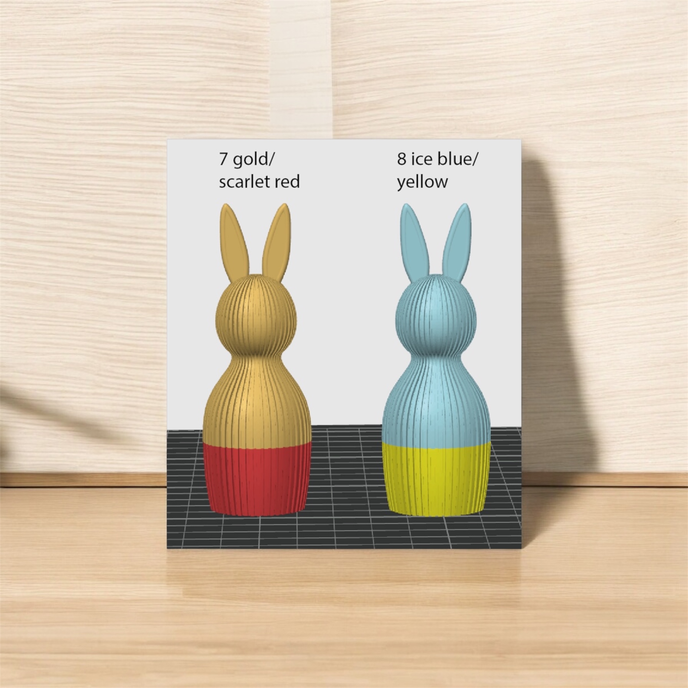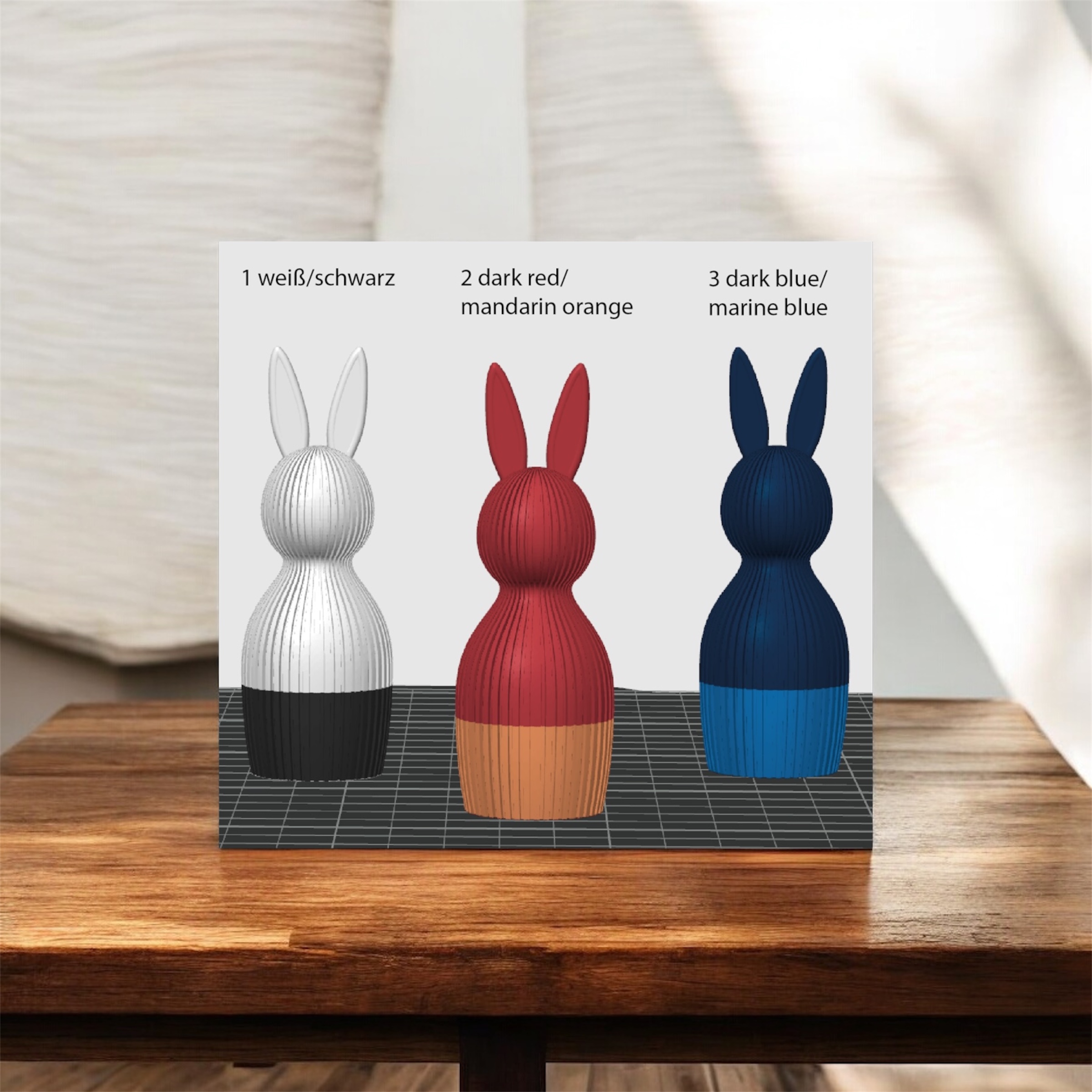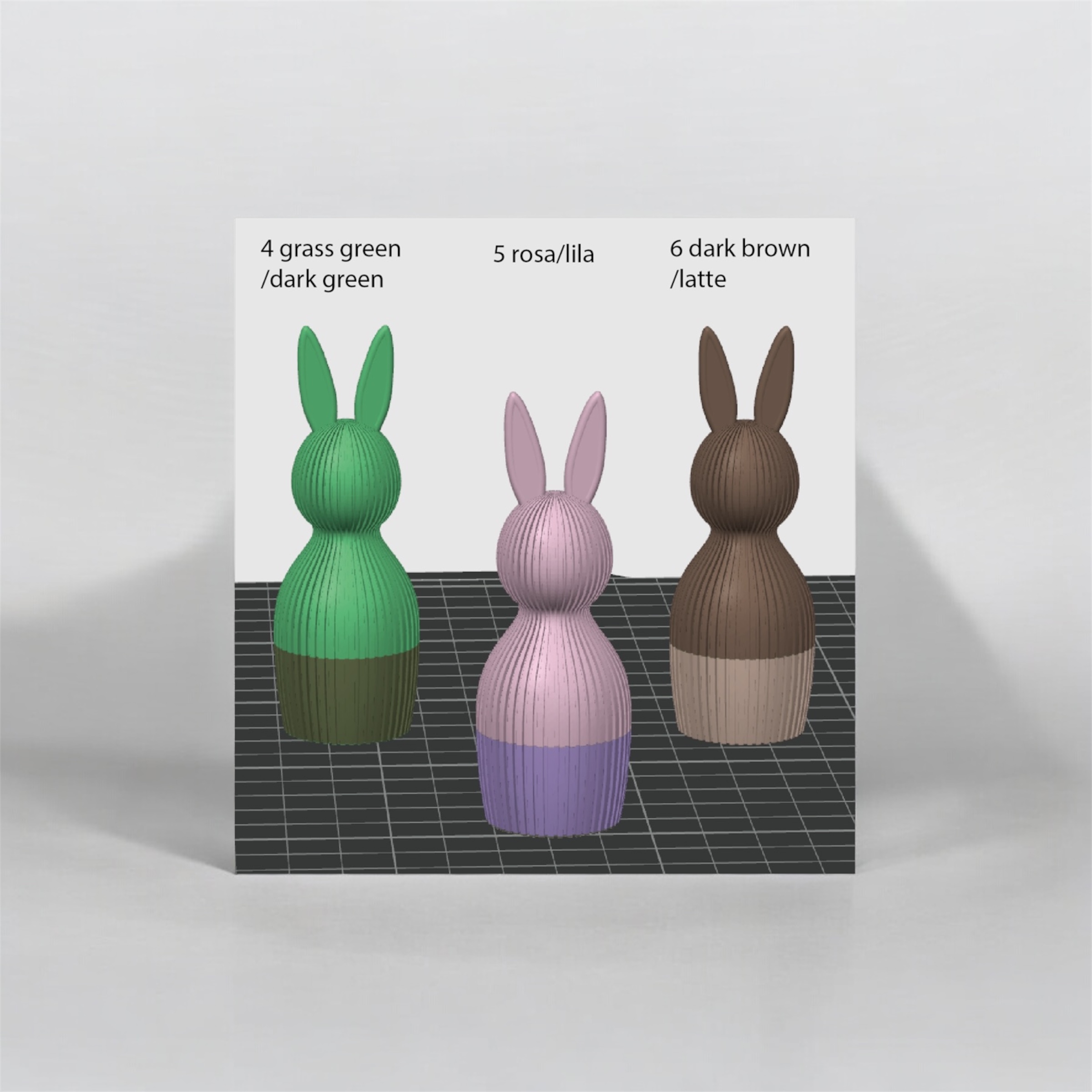 Nachhaltiger 3D-gedruckter Osterhase im modernen Rillen-Design aus biologisch abbaubarem PLA – charmante Osterdekoration einfarbig oder in zweifarbiger Gestaltung (ca. 16,9 x 6 cm). Wählbar aus 8 attraktiven Farbkombinationen – weitere Größen und Änderung der Farbenkombination auf Anfrage möglich! Fertigung nach Bestellung: Jeder Osterhase wird individuell für Sie hergestellt.