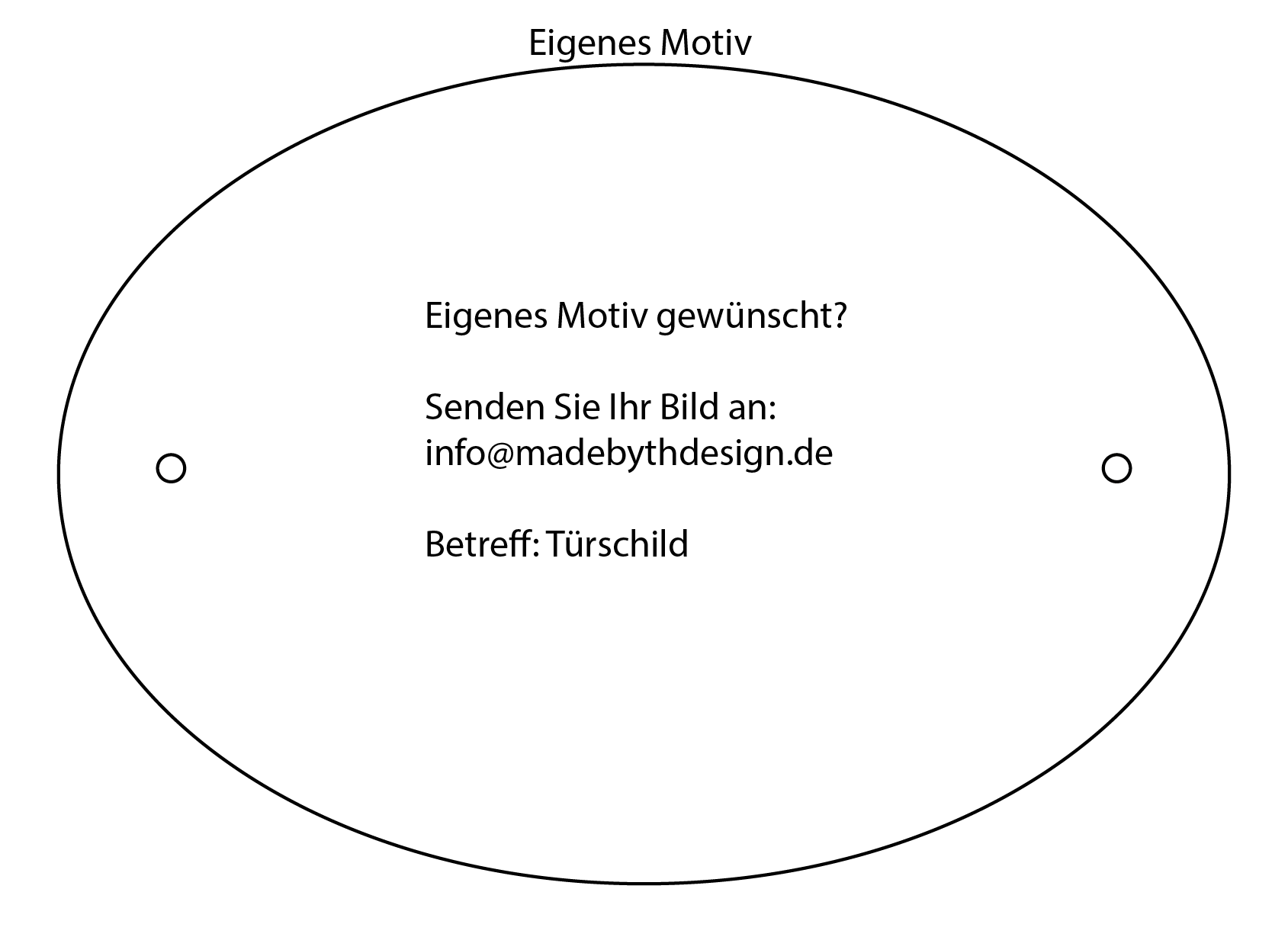 • Bei “Eigenes Motiv”: Senden Sie uns Ihr Bild per E-Mail (Betreff: Türschild) und vermerken Sie im Kommentarfeld beim Checkout “Eigenes Motiv”. Wir passen Ihr Motiv bei Bedarf an, damit es optimal auf die ovale Vorlage passt.