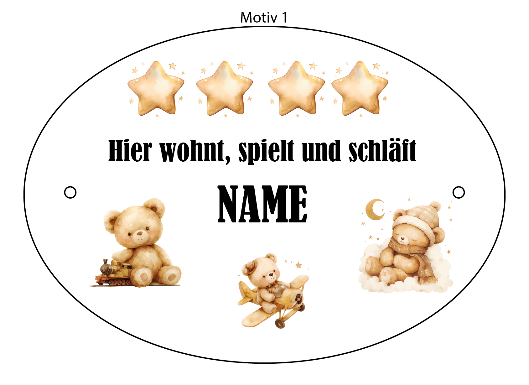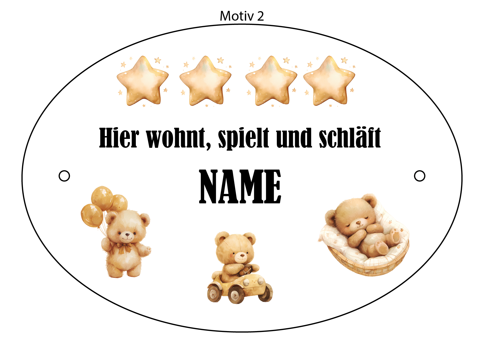 Personalisiertes ovales Türschild aus weißem Kunststoff (127 x 88 mm, 2 mm stark) – Wählen Sie aus 2 fertigen Motiven oder senden Sie Ihr eigenes. 4 Hintergrundfarben (Gelb, Blau, Rosa, Grün). Geben Sie den Wunschnamen ein. Mit 2 Bohrungen. Perfekt für Kinderzimmer! Farbhinweis: Die tatsächlichen Farben können von der Bildschirmdarstellung abweichen. ℹ️ HINWEIS: Bei “Eigenes Motiv” bitte im Kommentarfeld vermerken und Bild an info@madebythdesign.de senden!